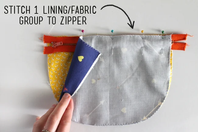 Step 3: With right sides together, sandwich other side of zipper between second lining fabric pair of fabric. Stitch in place. Press fabric away from zipper as shown below.